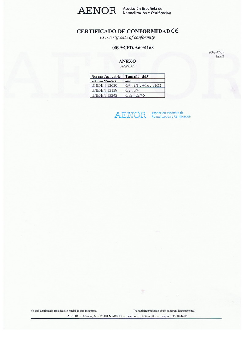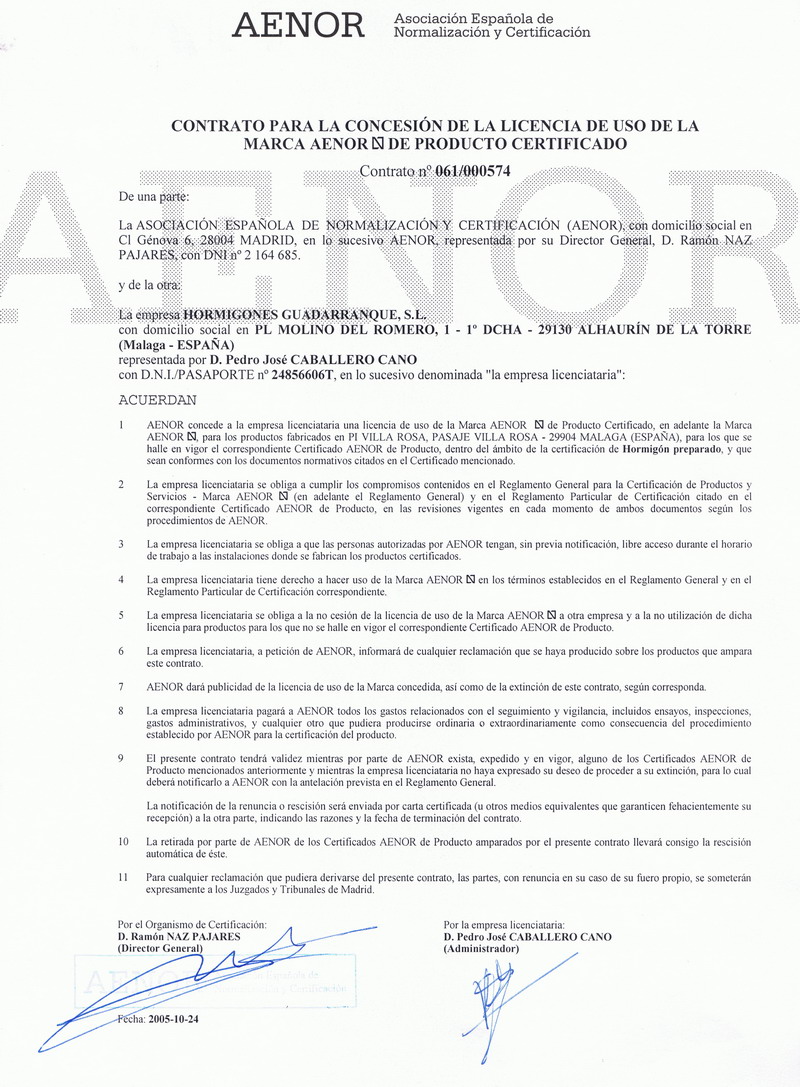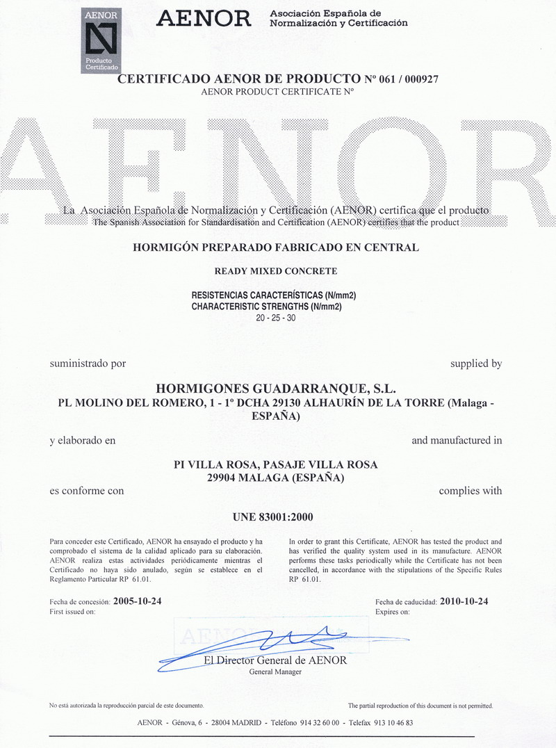 La búsqueda constante de la calidad del producto tiene su reflejo en la consecución del sello AENOR de productos para hormigón fabricado en central (nº 061/000927), lo cual garantiza el cumplimiento de los estándares de calidad establecidos por el organismo certificador para nuestros productos.