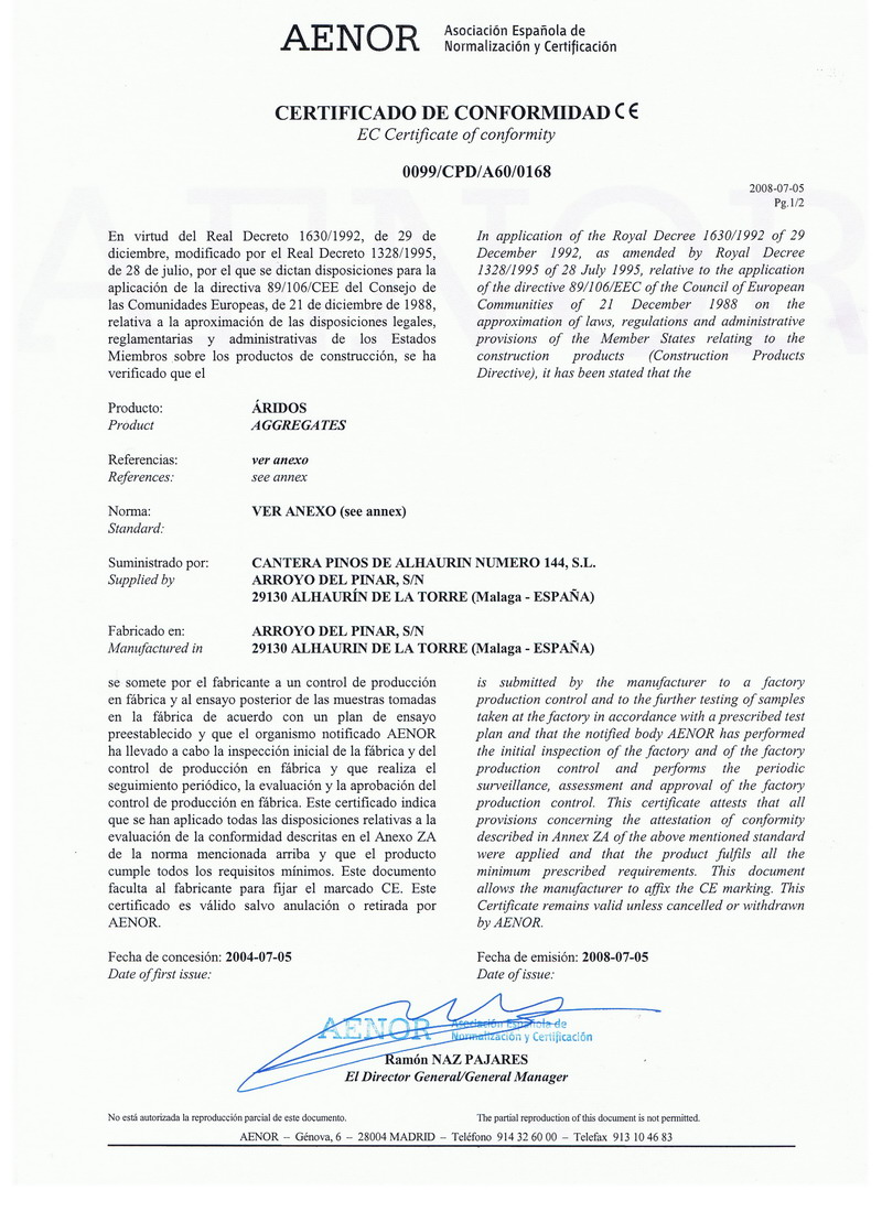 Certificado CE de Conformidad Cantera Pinos Alhaurín Número 144, S.L.